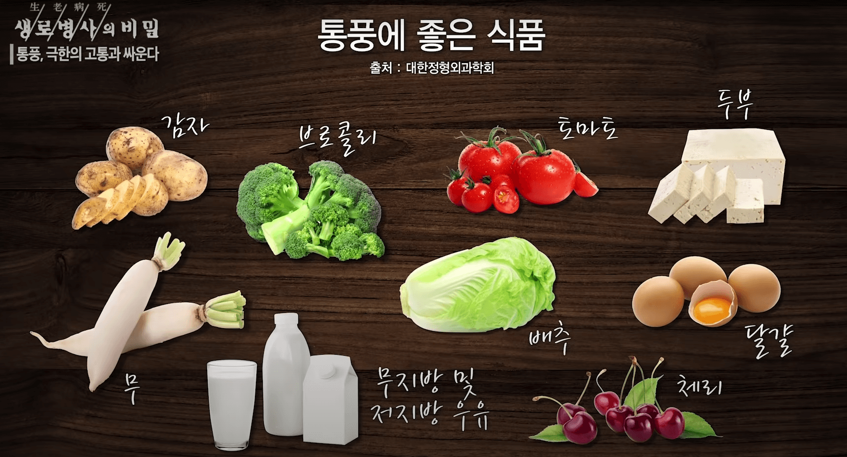 ■통풍에 좋은 음식 : 감자, 브로콜리, 무, 토마토, 두부, 달걀, 무지방 또는 저지방우유, 배추, 체리, 수박, 바나나, 양파, 곶감, 메밀, 참외, 알로에, 커피, 코코아, 버터, 스파게티, 고구마, 각종곡류, 식초, 김, 미역, 물, 아몬드, 카카오(초콜릿), 크랜베리류, 스피루리나